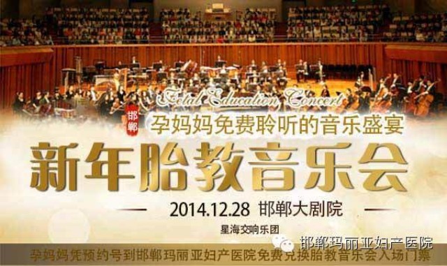 2014年12月28日,“聆听母爱·感受幸福”新年胎教音乐会在邯郸大剧院隆重举行。本次新年胎教音乐会由邯郸市妇女联合会、邯郸市计划生育协会、邯郸市教科文卫工会、邯郸广播电视台联合邯郸玛丽亚妇产医院共同举办,胎教音乐会现场演绎中外名曲近二十首,还邀请台湾爱和乐音乐胎教创始人陈品瑜女士、北京妇产医院产科专家陈宝英女士、台湾产后康复专家郑素娟女士亲临现场,传授音乐胎教知识和专业的孕产知识,让广大孕产妇享受来自台湾的孕产医疗新模式。