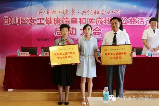 邯郸邯山区总工会女工保障部李彦部长、玛丽亚妇产医院的领导、邯山区工厂工会领导以及首批接受援助的贫困女职工参加了启动大会。启动大会上,玛丽亚妇产医院被授予“贫困女工医疗救助爱心公益单位”和“外来女工健康体检定点医院”。